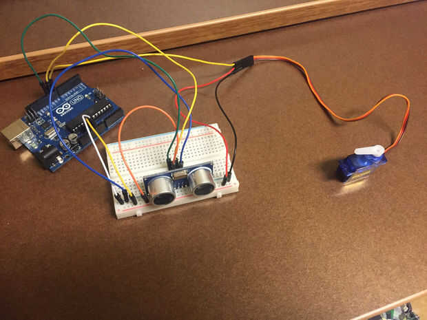 Para todo el proyecto a trabajar debe establecer de alguna manera todo lo que de alguna manera todo vuelve a la placa Arduino, que es el cerebro del sistema de control. Como veis en la foto, los cables de servo ir primero a la placa, pero luego hay un segundo par de cables que van al Arduino que dar alimentación al Servo. El sistema de control era bastante simple de configurar, ya que sólo requiere un sensor de proximidad y un servo para operar. En la imagen que se muestra puede ver que el sensor de proximidad se pone directamente en el protoboard, sin embargo en el proyecto final no podríamos tener ningún cable que muestra. Para solucionar este problema he utilizado cuatro cables de extensión de mujer puente para conectar las cuatro puntas que representan, de izquierda a derecha: Vcc (alimentación), gatillo, eco de tierra; a la placa arduino. Asegúrese de conectar cualquier cable decide usar para el cable de tierra en el tren azul en el protoboard de lo contrario el sensor de proximidad no será capaz de operar, el mismo es necesario que el cable salvo enchufe en el riel de alimentación. Utilice otro cable para conectar el cable de tierra a Arduino de la protoboard y enchúfelo en el conector de tierra en el Arduino y el enchufe de su otro cable en el perno anterior marcado 5V. También para el sensor de proximidad Asegúrese de conectar el segundo cable para el diente echo número pin 8 en la placa arduino y el gatillo en el número 9. Para el servo enchufe el cable número 5.
