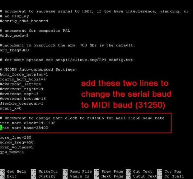 Debería ver algo como la foto de arriba. Guardar (Ctrl + 0) y salir (Ctrl + x). A continuación, editar el cmdline.txt y inittab.txt para desactivar el acceso a la shell de Pi de UART (dejando abierto para acceso de MIDI). Hacer una copia de cada archivo en caso de ensuciar para arriba: