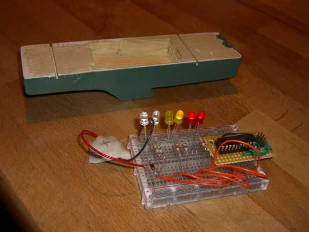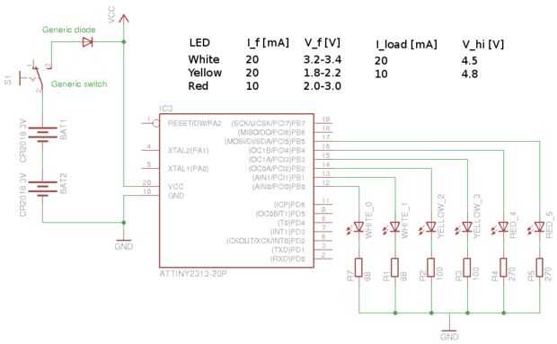 Acerca de (4 * 20 + 2 * 10) mA para LEDS y 2mA para el ATtiny2313, así un peor de los casos de