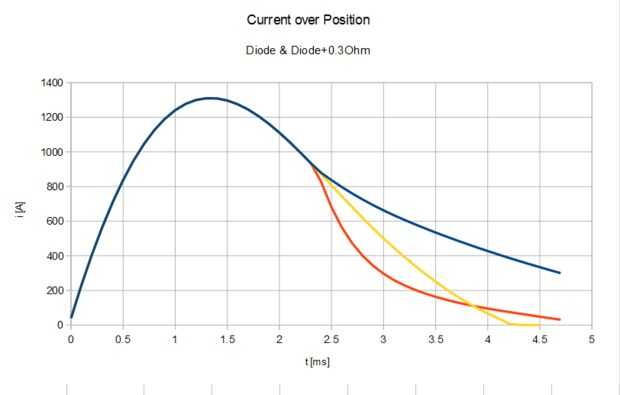 El diodo por sí mismo prolonga el flujo de corriente durante bastante tiempo, en comparación con ningún diodo, que conduce a más suckback del lingote de la. Mediante la adición de la 300milliOhm para el diodo, la corriente cae mucho más rápido.
