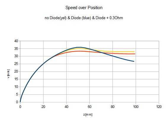 El efecto sobre la velocidad final se muestra en el gráfico siguiente (velocidad sobre posición). Las diferencias demuestran después de unos 30mm de recorrido de slug, después de que se descarga el condensador y la bobina lleva la energía.