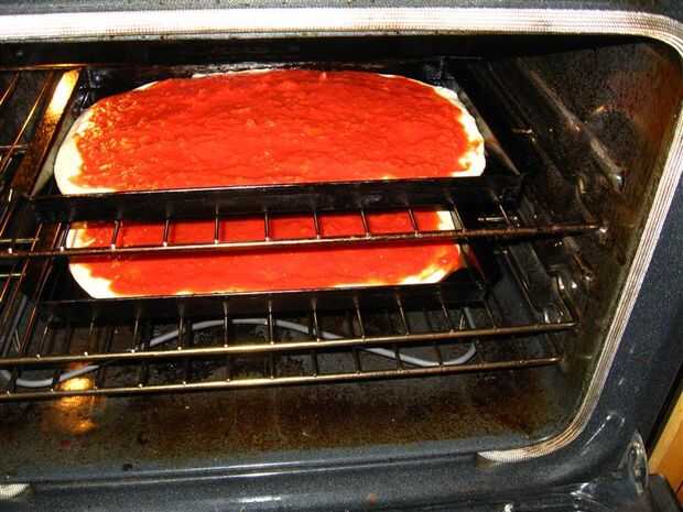 Nota Si te gusta la pizza bien abajo agregar tiempo entre dos ciclos de Bake (hornear) antes de aplicar el relleno. Como dije, cocinar la pizza con los ingredientes hará que la grasa en el queso para salir y hacer muy grasoso.