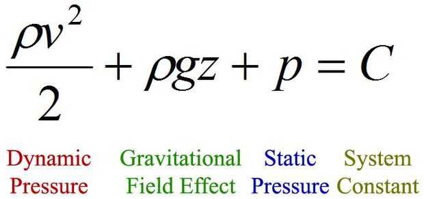 Esta ecuación es básicamente una reafirmación del principio de conservación de la energía, que sólo se aplica a un continuum incompresible. Agua puede ser asumido como tal para la mayoría de aplicaciones, incluyendo éste. La ecuación indica que para cualquier ubicación, o nodo, dentro de un sistema cerrado, la presión dinámica y el efecto del campo gravitacional y la presión estática será igual a una constante que no cambia de sistema. La presión dinámica es igual a la densidad del agua multiplicada por la velocidad en el nodo, dividido por 2. El efecto del campo gravitatorio es la densidad del agua, multiplicada por la aceleración debido a la gravedad (9,8 m/s2), multiplicada por la altura del nodo, tomado desde un punto de referencia arbitrario pero constante. La presión estática es simplemente la fuerza dividida por el área en el nodo. Por último, la constante de sistema es un desplazamiento constante potencial de todo el sistema, que puede ser cero.