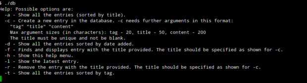 Esta es una versión del souped-up de la tarea de tomar notas en la línea de comandos. Almacena la fecha actual, una etiqueta, un título y una nota como una entrada en un archivo. La base de datos producida no es particularmente legible o fácil de modificar, pero es en un formato bien estructurado.