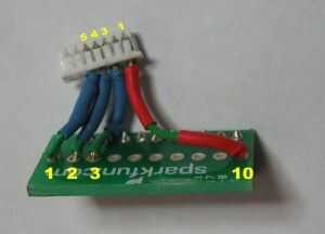 El conector abierto debajo de la cubierta tiene 7 pines pero necesita solo 4 de ellos. Si usted tiene una herramienta que se puede utilizar, de lo contrario solo soldar los cables a los terminales y colocarlo en la caja en las posiciones 1, 3, 4 y 5 como se muestra en la fotografía.