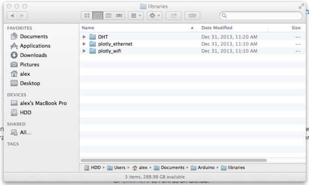 Usted querrá soltar las carpetas de la biblioteca en la carpeta de la aplicación de Arduino. Nuestro está en: / usuario/documentos/Arduino/bibliotecas. Siempre puede comprobar sus preferencias de Arduino para averiguar donde tuyo si no lo encuentras.