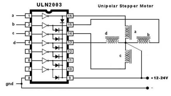 Su fácil de utilizar un microcontrolador como un Arduino para controlar la secuencia de conmutación, pero para hacer cualquier cosa útil que necesitamos ser capaces de motores que típicamente una corriente mucho mayor que el Arduino puede manejar por su cuenta. Para lograr esto, utilizamos un chip como el ULN2003 que es sólo un banco de 7 transistores darlington, que puede cambiar hasta 24V y cargas de hasta 500mA por pin de salida – perfecto para un motor de pasos pequeños.