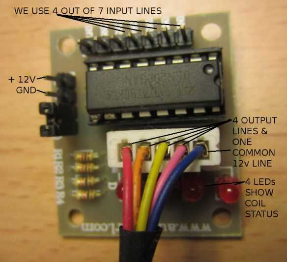 Como se puede ver en el circuito anterior, para controlar el motor paso a paso, tenemos que usar sólo 4 de los 7 transistores darlington disponibles en el ULN2003 ya que nuestro motor tiene 4 bobinas. Como se puede ver, hay 7 pines de entrada (uno para cada transistor darlington). Un total de cinco hilos salida el tablero y conectar al motor paso a paso. Cuatro de estos alambres son las líneas de salida de los transistores en el chip ULN y un cable es el + 12V de la fuente que utilizaremos para conducir el motor paso a paso. También hay 4 LEDs rojos (uno para cada línea de salida) que encienden cada vez que ese particular bobina es excitada.