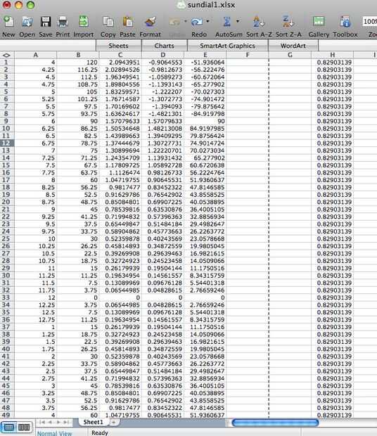 Esto tendrá que hacerse por cada línea que se va a poner en el reloj de sol. Pero no te preocupes, Excel está aquí para salvar el día! Arriba, puede ver una pantalla de captura de mi hoja de cálculo con las ecuaciones usadas en cada columna.