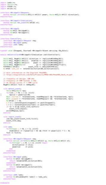 El módulo mkController implementa la lógica de la base de nuestro proyecto. Exporta las interfaces 'pins' que se utiliza para conducir el hbridge módulos y la interfaz 'req' que se invoca de SW a través de un portal. Es argumento ctor solo es una interfaz 'ind' por el cual el controlador invoca SW funcionalidad a través de un portal de segunda. La lógica es intencionadamente simple y debe ser fácilmente comprensible para incluso un principio programador Bluespec.