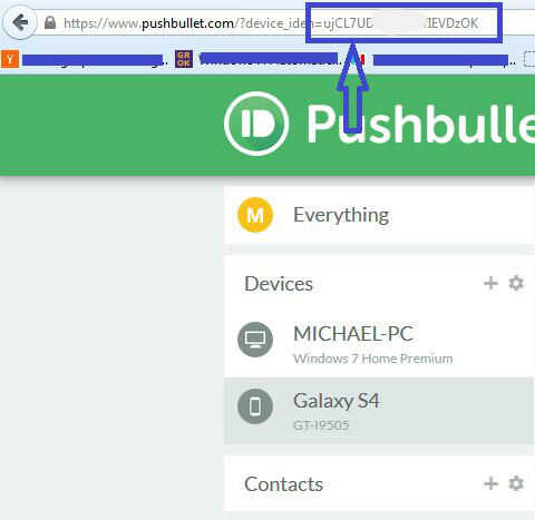 Las dos últimas variables son opcionales. Si quieres sólo recibir notificaciones en un solo dispositivo, cambiar la variable $vSendToAll en False y escriba el DeviceID para ese dispositivo en particular. Para encontrar el DeviceID, debe abrir la Página Web de PushBullet, Inicio de sesión y haga clic en el dispositivo en la columna de la izquierda. Ahora se encuentra el ID como parte de la URL actual. Compruebe la imagen de arriba para ver cómo podría.