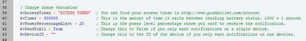 Desplácese por el guión y buscan "cambiar estas variables". Alternativamente, puede presionar CTRL + F y hacer una búsqueda para encontrar un poco más fácil. Estas son las variables que tienes que cambiar. La primera variable es su Token de acceso de PushBullet.