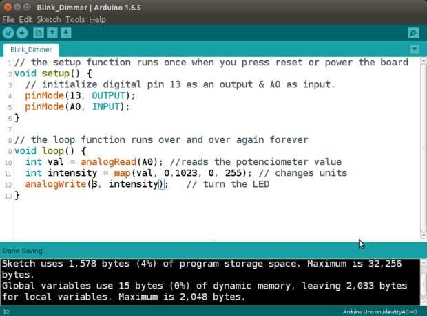 El código es muy sencillo. Como se ve en la línea 4 y 5 es donde se inicializan los pinos, el 3 de salida y el A0 de entrada. En la línea 10, se lee el valor del potenciómetro a través del pin análogo A0, y en la línea 11, debemos cambiar la lectura, de valores entre 0 y 1023, a valores entre 0 y 255, de la envían son los se le llevó en la linea 12, mediante el comando analogWrite. Acá encuentran el código