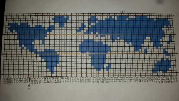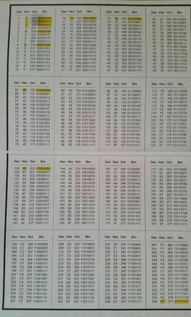 Ahora esto era sólo mi segunda vez viendo hexagonal y estaba bastante desorientado. He encontrado la tabla de conversión hexadecimal-binario adjuntada, que ayudado inmensamente. Esta tabla puede utilizarse para convertir el valor binario de cada columna o (Byte) a un valor hexadecimal. Por ejemplo si nos fijamos en la última foto en este paso usted puede ver cómo la imagen del mapa del mundo era se rompió en tercios de arriba a abajo y cada columna se compone de 3 Bytes, donde blanco off = 0 y azul o en = 1. En la parte inferior de cada columna el Byte se ha convertido en un valor hexadecimal entre 00 y FF que es el equivalente a un rango de valor decimal de 0-255 o un rango binario de 00000000 a 11111111.