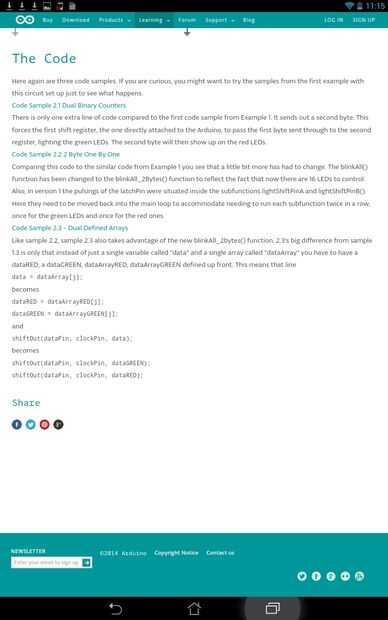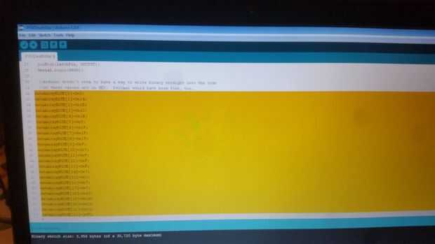 Como se mencionó anteriormente, he utilizado el código muestra 2.3 – Dual definido conjuntos"" en el ejemplo de Arduino ShiftOut como mi base. Como te darás cuenta en este código el autor comenta que él no está seguro si Arduino puede manejar valores binarios directos, tan valores hexadecimales se utilizaron en su lugar. Nota: he no cambiado nunca los comentarios binario junto a los valores Hex, sólo cambié los valores Hex para encajar mi imagen mapa del mundo.