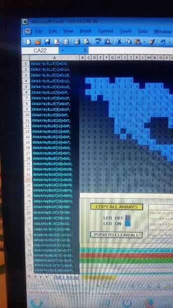 ! ¡ Actualización! Dibujar en la imagen utilizando 1s para representar, que automáticamente se color azul del píxel. Cuando la imagen esté lista Pulse el botón de "Copia todas las matrices" y pegar sobre los arreglos de discos existentes en el sketch de Arduino! He subido un nuevo dibujo a este paso.