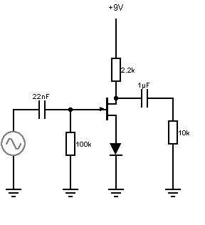 Cómo funciona esto es que la resistencia de la fuente se reemplaza por un diodo. Tipos de diodo funcionará mejor con JFETs diferentes. Por ejemplo, un diodo 1N4001 o 1N4148 estándar tendrá una Vf (caída de tensión directa) de aproximadamente 0.6 v-0.8v. Otro tipo de diodo es un diodo de schottky BAT54 que tiene un Vf como 0.3v. Cada uno de estos tipos de diodo a sesgo el JFET diferentemente dependiendo de la Vgs(on) de JFETs.