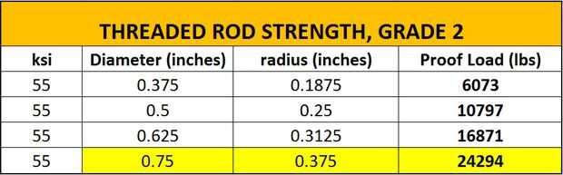 He hecho una hoja de cálculo en Excel para mostrar algunas de las cargas de prueba para varios NC (rosca nacional gruesa) grado 2 caña.