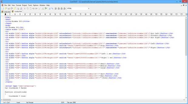 El archivo roomba.html contiene un poco de javascript diseñada para emitir las solicitudes al pulsar un botón apropiado. Hay dos tipos de botones. Botones repetición reproduce un código repetidamente hasta que uno deja ir el botón. Uso de un modo infinito y código ontouchstart y onmousedown para trabajar en ambos táctil y ratón basado en navegadores. (Aunque soy un experimentado programador de C y un programador java experiencia algo, soy completamente nuevo en javascript, por lo que puedo no estar haciendo las cosas la mejor manera.) No-repeat botones juegan un código una cantidad determinada de tiempo por lo que no Haz perdido y hacerlo a través de onclick. Hay funciones javascript diferentes a estos.