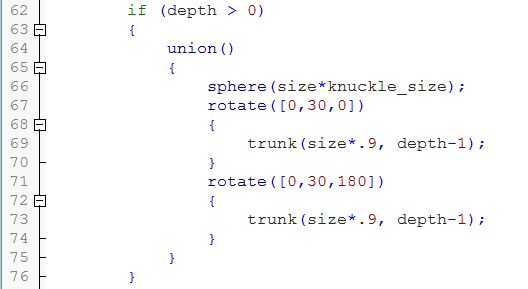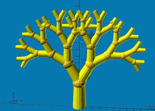 Hasta ahora has creado un palo en el suelo, pero no un árbol. Un árbol tiene ramas. Dentro del módulo "branch_one", editar el código que llama "tronco" dos veces, una vez con una pequeña cantidad de rotación a la izquierda y una vez con una pequeña cantidad de rotación a la derecha.