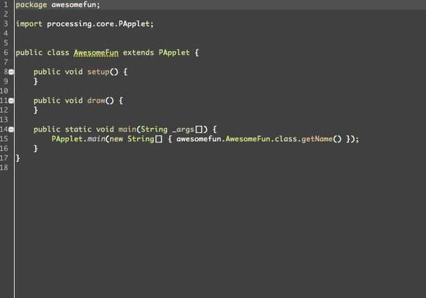 Nuestra clase de aplicación ahora se llama AwesomeFun, que se extiende de PApplet. Esto, a su vez, extiende la clase de Applet de Java.