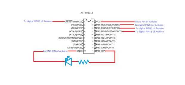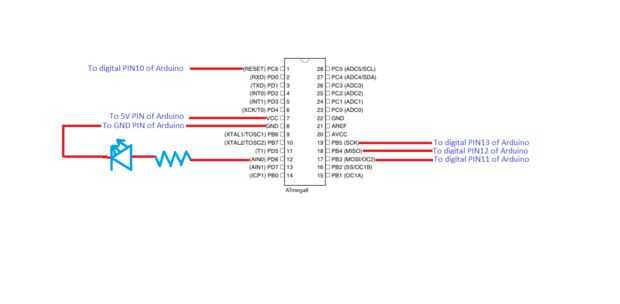 Este es el esquema mínimo para programar un AVR utilizando Arduino. He dado circuitos para tres AVRs muy común. ATMega328p, ATMega8 y ATTiny2313. Pero después de ti por debajo de la conexión de perno, usted puede fácilmente programar cualquier AVR.