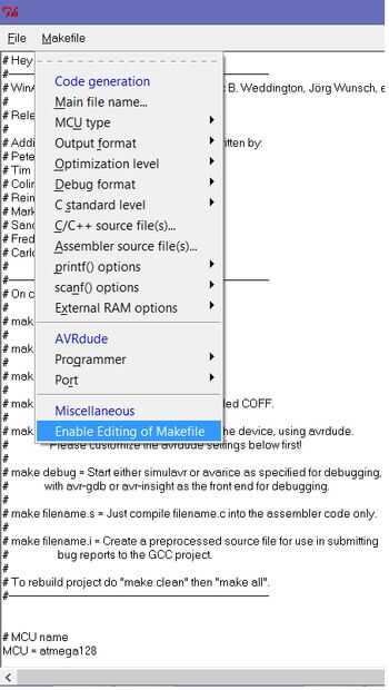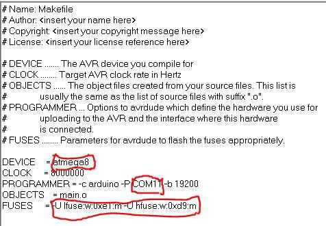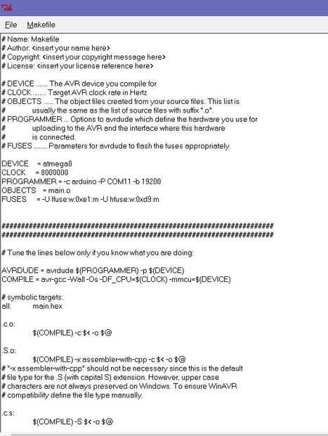 Makefile es un archivo sin extensión. Comandos del compilador para cargar el código según la propiedad de destino AVR y del programador. Por lo tanto, es realmente muy importante configurar un Makefile apropiado. Sin conocimiento en lenguaje AVR y C, no puede hacer un Makefile. Así que incluido una plantilla. basta con editar según su IC AVR.