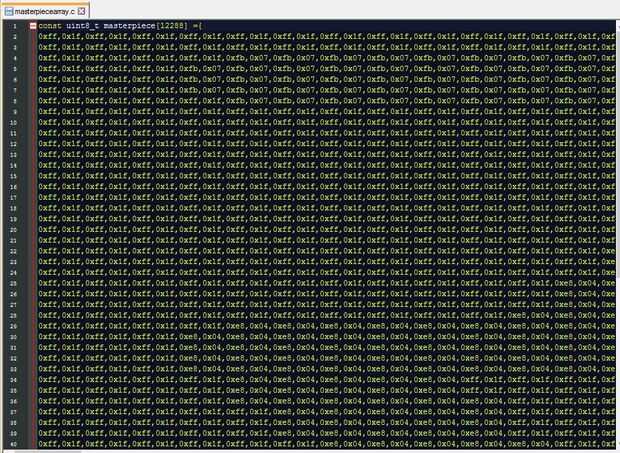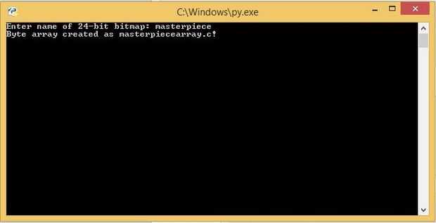 Copia el script bitmaptoarray.py en la misma carpeta como su obra maestra y ejecutarlo. Cuando se le solicite, escriba el nombre del archivo de mapa de bits y pulse Intro. Si funcionara debería ver "matriz de bytes creado como masterpiecearray.c!" Dentro de su carpeta, verá un archivo .c nuevo que contiene la matriz.