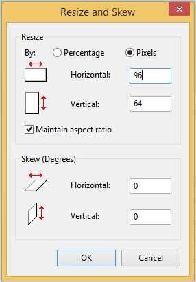Abrir paint y haga clic en cambiar tamaño. Cambiar el tamaño de la imagen a 96 píxeles horizontales por 64 píxeles verticales.
