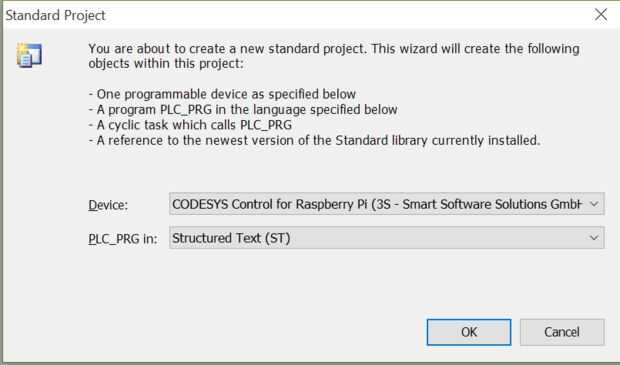 -En la ventana nueva, en el dispositivo, seleccione «Control de CODESYS para Pi Rasperrby» y en PLC_PRG, seleccione "texto estructurado (ST)".