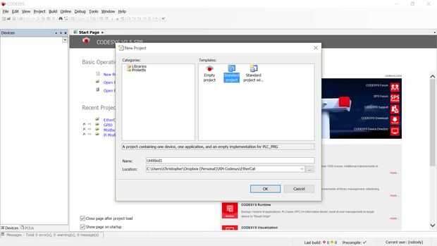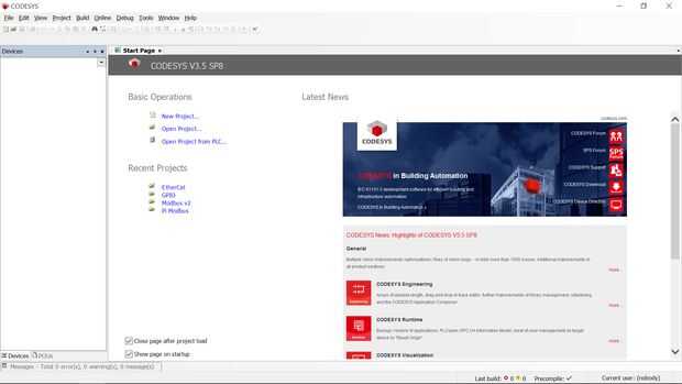 Abrir a CODESYS desde su menú Inicio o el acceso directo del escritorio, tienes que abrir uno que dice "CODESYS V3.5 SP8 Patch 2" (era SP8 parche 2 en el momento de comenzar a escribir este Instructable). Usted debe presentarse con algo que se parece a la foto, con una página de inicio que muestra noticias CODESYS etc..