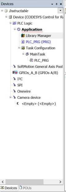 Os habréis fijado en la izquierda de la pantalla, ha aparecido un árbol de dispositivo (ver figura). CODESYS ha automáticamente creó un programa principal (PLC_PRG) y una de las tareas (MainTask) desde que se llama el PLC_PRG de. PLC es dispositivos de tiempo real que ejecutan tareas en diferentes ciclos. Gestión de tareas puede ser complicado así que no voy a entrar en esto ahora sin embargo se cubre en Youtube tutoriales sobre CODESYS. Todo lo que necesitas saber es que el PLC_PRG se ser un ciclo a través de cada vez que la tarea se ejecute (cada 20ms por defecto), leyendo las entradas y configurar las salidas nuevo, esencialmente un enorme bucle continuo. Vamos a escribir nuestro primer programa para el control de lo GPIO de la Pi en el paso siguiente. Pero primero cómo conectar con el Pi.