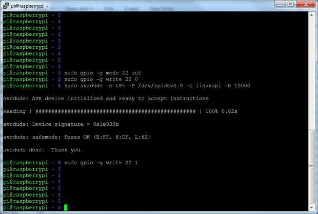 sudo avrdude -p t85 -P /dev/spidev0.0 - c linuxspi -b 10000