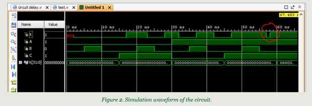 Como el propósito de este banco de prueba es demostrar el error, en lugar de simular todas las posibles transiciones de entrada, Disenaremos una secuencia de entrada que puede provocar la falla en la salida del circuito. Observando el circuito, hay una trayectoria desequilibrada entre la entrada B y salida X (es decir, hay dos caminos para propagar los cambios de B a la salida con diferentes retardos). Así que la falla ocurre cuando A y C son constantes y B cambia. Aquí está la descripción que vamos a crear en el bloque inicial de Verilog de banco de pruebas: