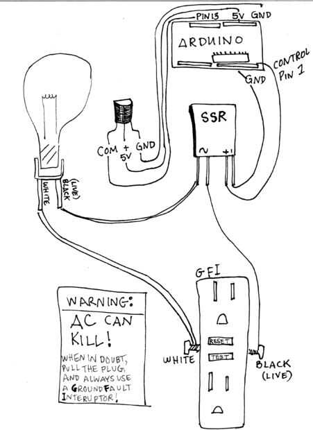 DOS ahora utilizan el dibujo para ejecutar cable de color desde el aparato de luz, sensor de temperatura, relé, arduino y GFI.