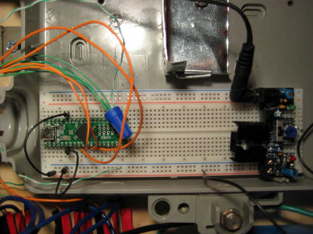 ¡ UNO! Lugar el Teensy y la ajustable fuente de alimentación en la placa misma. Hay dos conjuntos de pines en la parte inferior de la fuente de alimentación y los se ajusta perfectamente a un protoboard de 2 1/2" de ancho para que el negativo pernos y pernos positivos van en sus áreas correspondientes en la protoboard.