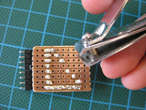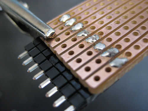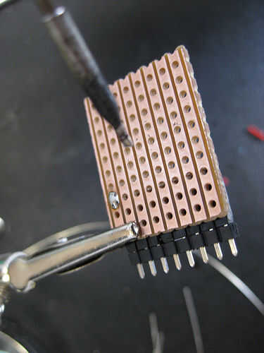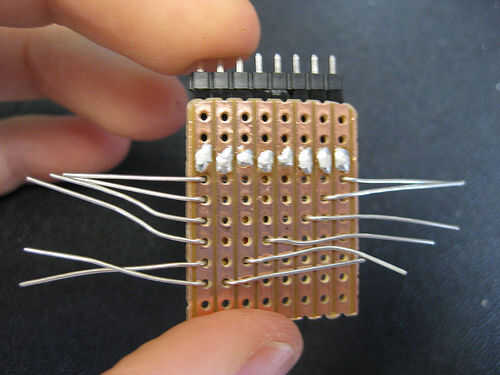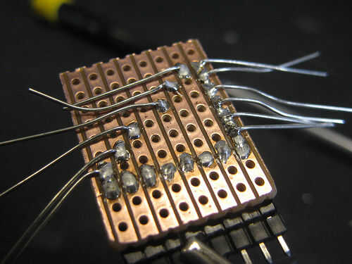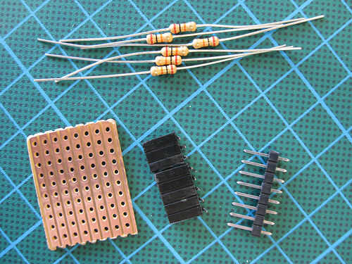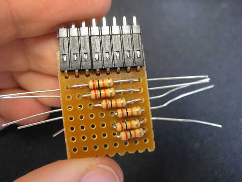Soldar las resistencias K 10 o 20 a la Junta como se muestra en la ilustración. La línea roja representa el VCC y la línea exterior donde se acumulan todas las resistencias representa la tierra. El resto son sus seis entradas digitales.