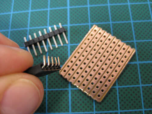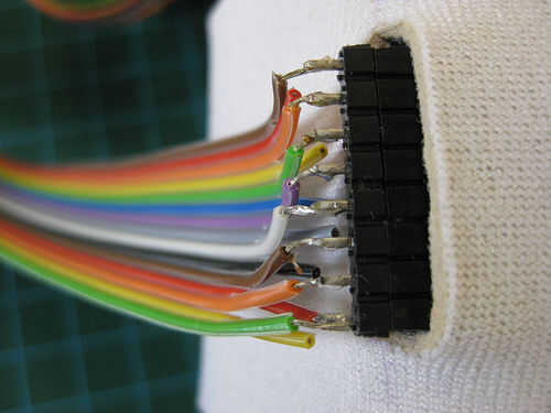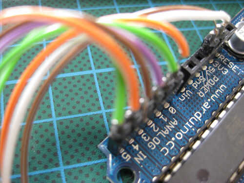Soldar el cable de cinta en una fila de encabezados masculinos 8. Este se enchufa en la pulsera. En el otro extremo, asegúrese de separar los cables VCC y GND y soldar estos dos encabezados hombre conectado. Estos se conectarán a los 5V y el GND de Arduino. El resto de los cables a una fila de seis cabeceras masculinas de la soldadura. Estos se pone en las entradas analógicas o digitales, dependiendo de su código. Decidí enchúfelos en mis entradas analógicas porque ya tenía el código de lectura funcionando en mi tablero. Pero no tarda más de 5 minutos para cambiar a digital.
