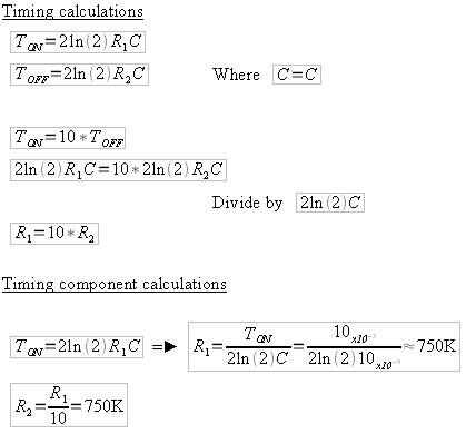 Suponiendo que se utiliza un condensador de 10nF y queriendo TON = 10ms y TOFF = 1ms, los siguientes cálculos se pueden hacer y entonces el diagrama del circuito dibujado.
