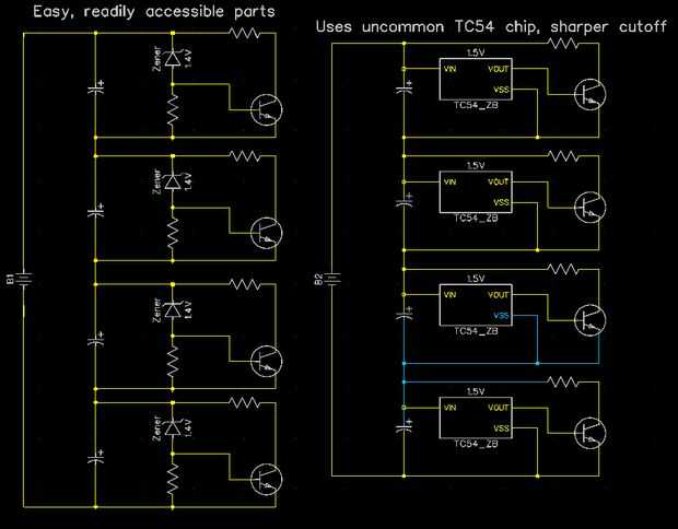 La segunda utiliza un chip especializado diseñado para apagar los circuitos cuando el voltaje cae demasiado bajo (normalmente porque la batería está muriendo). Gente de robótica BEAM usarlo con frecuencia, junto con su primo el 1381. Este chico es mejor que el zener, puesto que se aplica un voltaje mucho mayor a la puerta del transistor (casquillo voltaje-0.3 V), que hace más agudo.