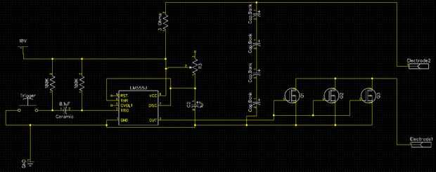 Mientras que la diversión, la técnica de conmutación "golpear dos piedras juntas" tiene muchos inconvenientes evidentes. Lo que debemos hacer aquí es probablemente aparejar un temporizador 555 como un "paso a paso" con un potenciómetro para cambiar la duración del pulso. Entonces pulso que puede utilizar para desencadenar un banco de mosfets (que felizmente son paralelo-izable para mayor capacidad de manejo actual) para descargar a través de sus electrodos. Un esquema posible es la segunda imagen en esta página. Quieres elegir R3 para variar en cualquier momento queremos-yo diría de 200k a 2 ohms M (dando un pulso desde aproximadamente 0,3 hasta 3 segundos). Tengo algunos grandes mosfets bocinazos (FDA032N08 que esperemos que puede manejar alrededor de 200A cada) en su camino; Podré probar esto pronto.