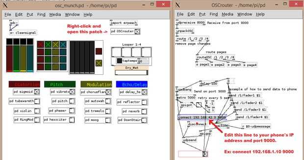 4. ejecutar el parche de OSC_munch PD-Extended y asegúrese de que el teléfono y el Raspberry Pi están en el mismo router WiFi (consulte el paso siguiente para aprender a crear una conexión AD-HOC sin un router).