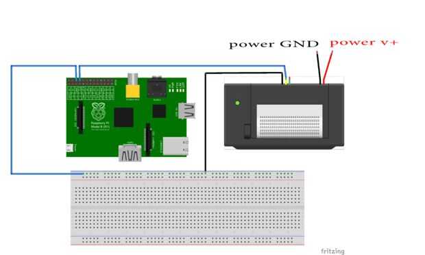 En un protoboard Conecte un conector de tierra de la Pi y un conector de tierra de la impresora a la línea de tierra. Finalmente en la protoboard Conecte el cable de rx de la impresora al pin tx en el Pi.
