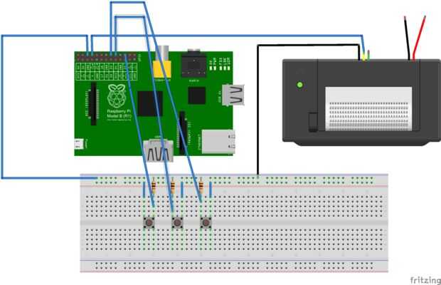 Siga el diagrama de cableado para conectar el teclado o los botones a su Pi. Si está utilizando un teclado debe ser un perno común que debe conectarse V ++ en la Pi; conectar 3 otros pines del teclado a las resistencias que se muestra en el diagrama.