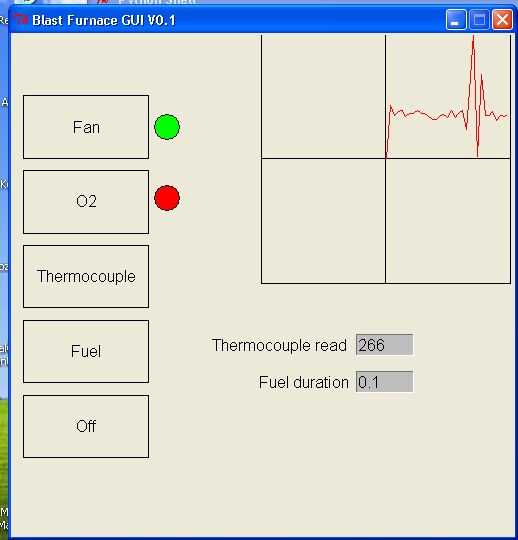 Se habilita la funcionalidad del GUI por el paquete de gráficos de Zelle, un paquete de gráficos fáciles de usar, de bajo consumo para python. Elegí el paquete Zelle sobre python más sofisticadas opciones de gráficos para su facilidad de uso y requisitos de recursos de sistema relativamente bajo. El GUI está configurado como un bucle while() principal, en el que la ventana es encuestada periódicamente con checkMouse(), lo que permite el programa realizar acciones autónomas (por ejemplo, el termopar, la lectura cada cierto tiempo) mientras se espera la entrada del usuario. También aparece la ventana gráfico de como el tiempo de la tirada completa de datos del termopar, que se actualización cada vez que se toma una nueva lectura.
