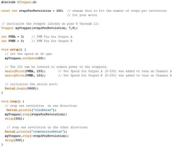 Como un bono adicional, este escudo también puede controlar un motor paso a paso solo hasta 5 voltios. Un motor paso a paso le da la capacidad para controlar la posición precisa sin la complejidad de los sensores de posición y control de lazo cerrado caro. El archivo zip sobre también contiene un código de ejemplo para controlar un paso a paso.