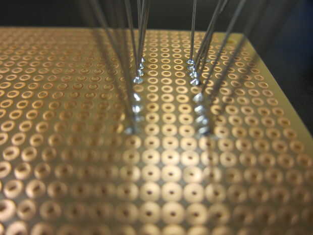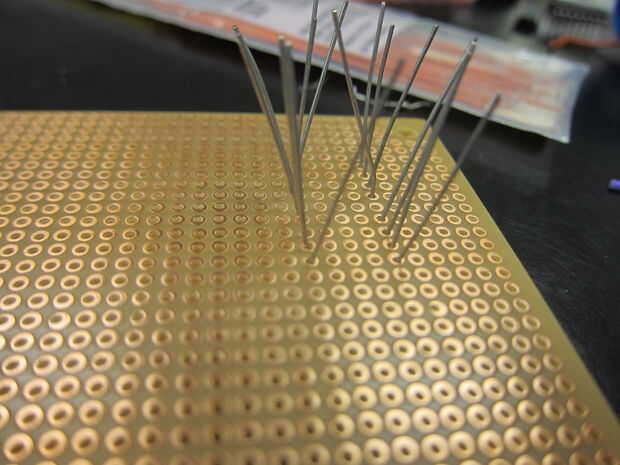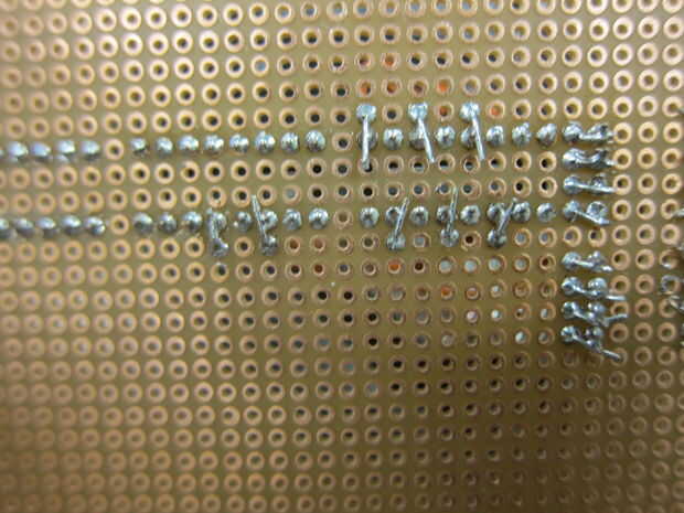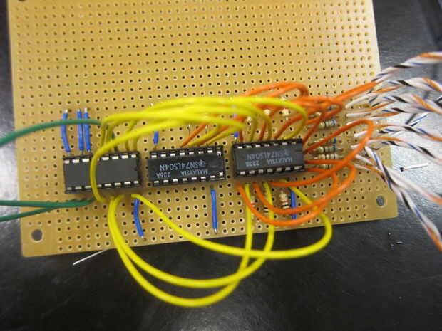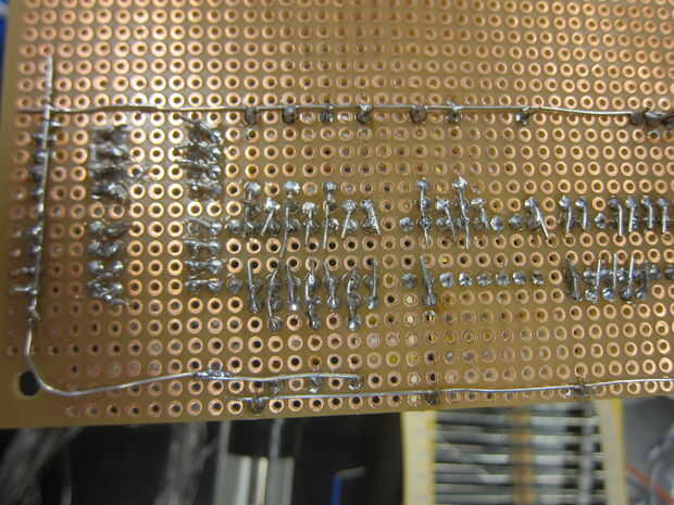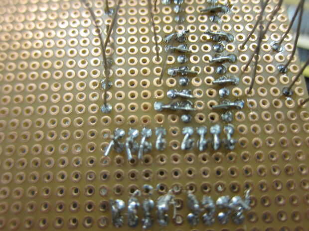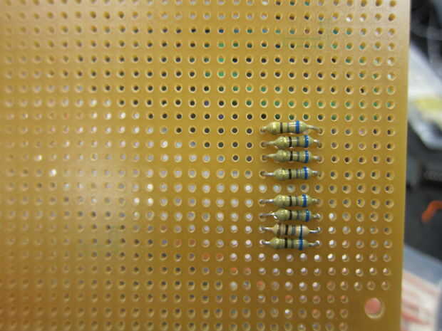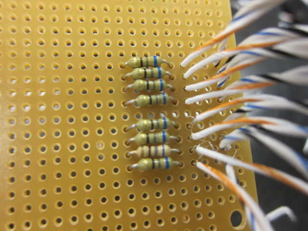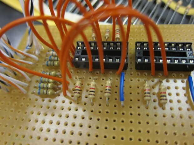 Las conexiones entre las resistencias, no puertas y multiplexor, utiliza los cables de puente corte en lugar de alambre trenzado. El cable de puente es más frágil, pero ya se corta en longitudes convenientes. Un puente de alambre en el extremo abierto de cada resistencia de la soldadura. Estos cables deben ser lo suficientemente largos para alcanzar a cualquier salida en los parte superior dos zócalos.