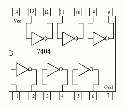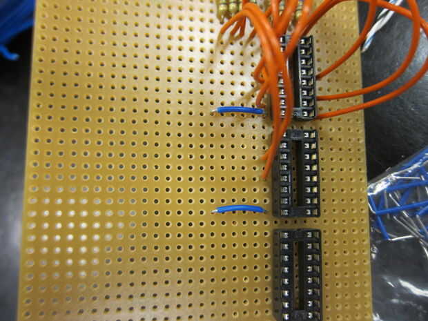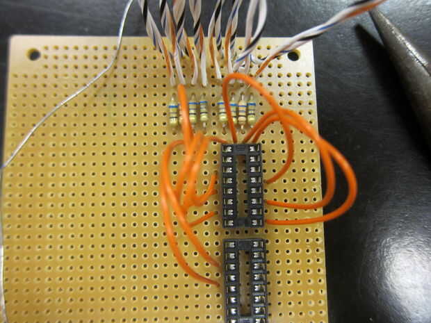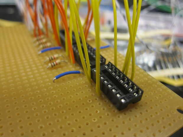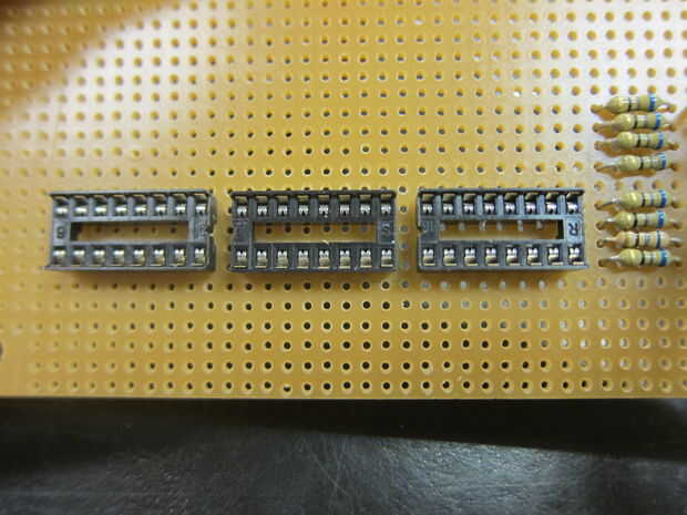 Aquí es donde usted querrá mantener un ojo muy de cerca en el diagrama del circuito para el 7404. Por un lado, el 7404 es un chip de 14 pines y los conectores tienen dieciséis pines. Decidí que pondría la 7404s en la parte inferior de la toma, vaciar la fila superior. Conectar todas las 7404 salidas a las resistencias de 68 ohmios. Las salidas son pines 2,4,6,8,10 y 12. Puesto que hay ocho LEDs y 6 salidas para cada 7404, use dos salidas de la segunda 7404. Pin 7 a tierra y conectar el pin 14 a 5v.