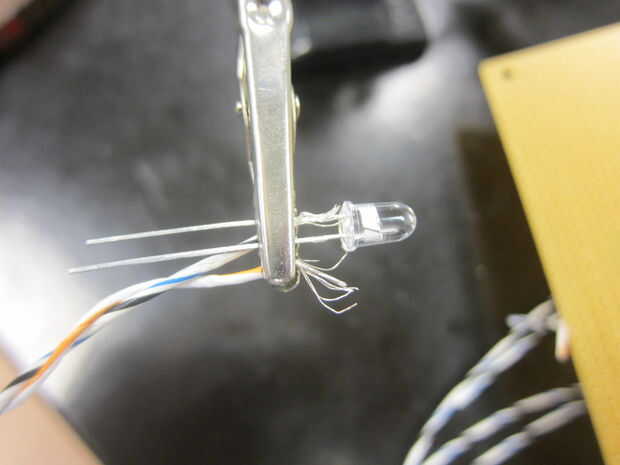 Para la soldadura actual, me resulta más fácil comenzar el final, con los LEDs. Desea un muy grande alrededor del alambre trenzado, aislado, en dos colores distintos. Corte ocho longitudes del panel cada uno, lo suficientemente largos para llegar desde el centro de la espalda (sentado detrás de la tercera capa de cuatro pulgadas) en cualquier esquina de la primera capa. Los cables para las capas segunda y terceros pueden ser más corto, pero siempre darte unas pocas pulgadas de hilo extra, como lo hará tu vida mucho más fácil más adelante uno. Elija un color del cable a la tierra y la soldadura de un lado al cátodo del LED. Asegúrese de que usted está de hecho soldadura al cátodo cada vez! Es el lado plano del LED, con la pierna más corta. Suelda el otro cable al ánodo y gire los dos cables entre sí para formar un solo filamento. La soldadura de los cables de tierra en una fila en el borde de la placa de circuito perforada. Suelde los cables del ánodo a la Junta, dos o tres agujeros por debajo de los cables de tierra, con un solo LED por columna. Conectar entre sí todos los motivos.