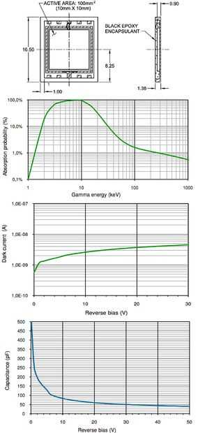(Leyendas de la imagen: (1) Especificaciones del fotodiodo X100-7: 100 mm ^ 2 zona activa, zona de 0,9 mm agotado, luz que bloquea la corriente oscura capa, bajo... Como se muestra en el diagrama de la probabilidad de absorción, los diodos PiN fácilmente absorben la energía de rayos gamma, (2) dos X100-7s montada en el PCB, cálculo del depósito de carga (3) para Americium−241)